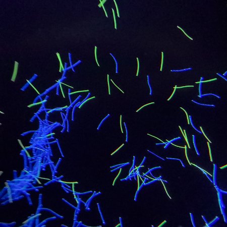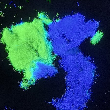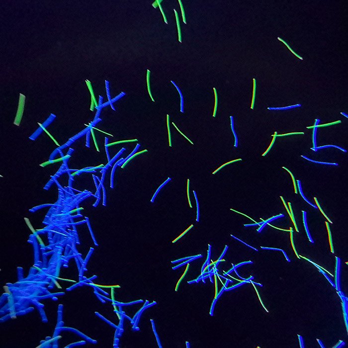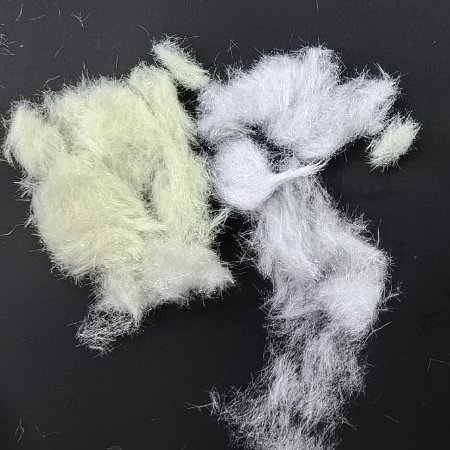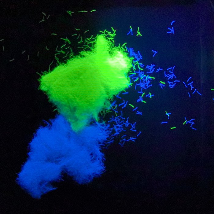 超细荧光纤维丝 | 表面无色,紫外灯下蓝、绿等 | 8-12㎛ | 0.5-10MM | 聚酯 | 纤维特细。長(cháng) 度 也 可(kě) 1MM 左右 |