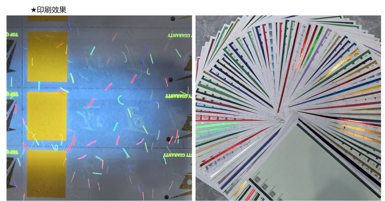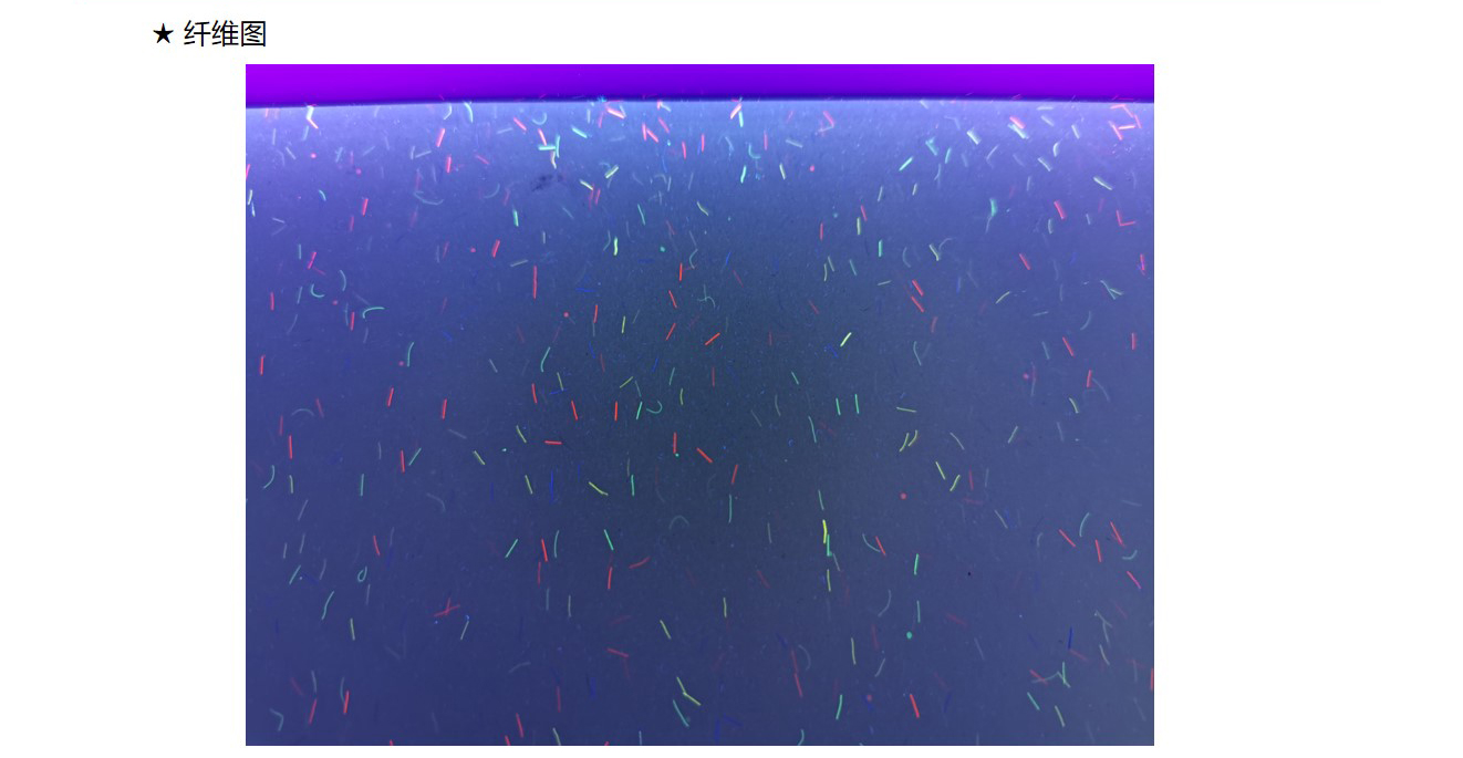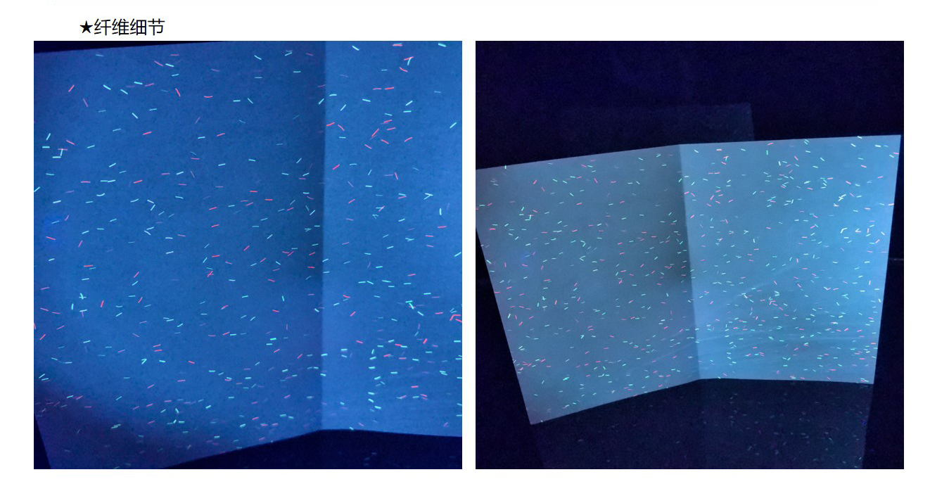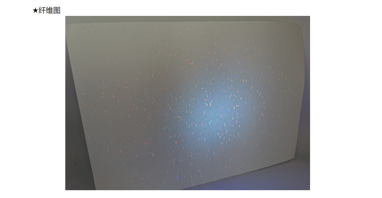 纤维纸:造纸时将红蓝等有(yǒu)色纤维或彩色小(xiǎo)片(点)掺入纸浆内,或在纸张未定型前撒在纸张表面,在紫外線(xiàn)照射下有(yǒu)荧光反射,使纸中(zhōng)带有(yǒu)區(qū)别于纸张本身的有(yǒu)色纤维。掺入纸浆中(zhōng)的红蓝纤维丝和彩点有(yǒu)彩色纤维与无色荧光纤维两种。