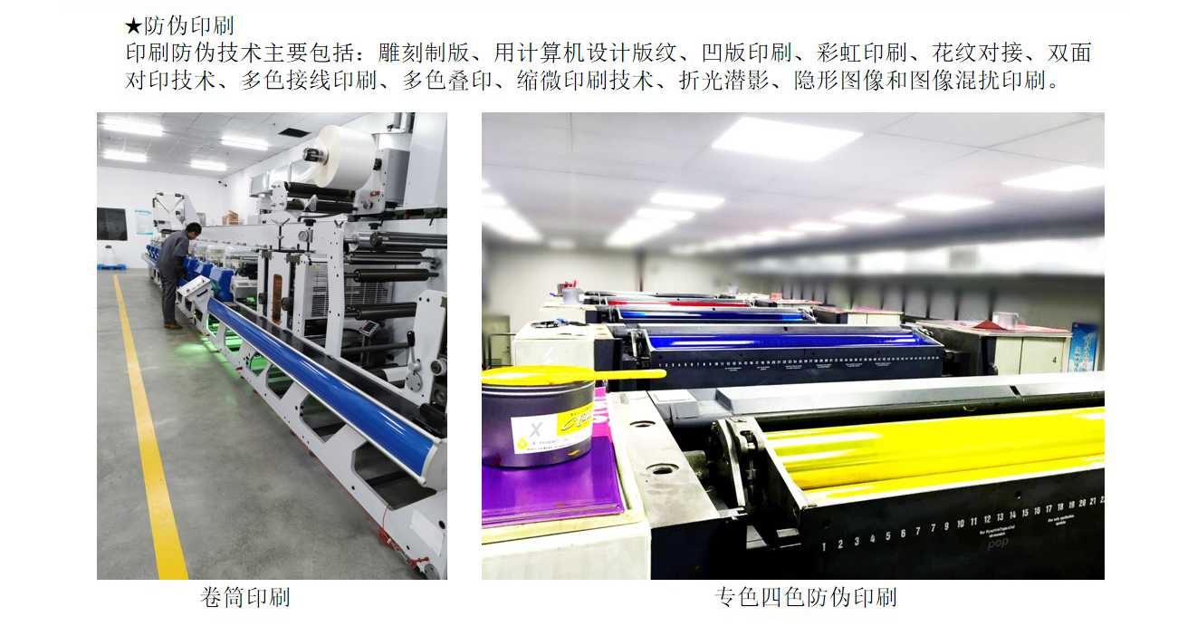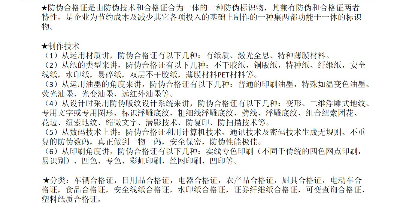 (6)从印刷角度讲,防伪合格证有(yǒu)以下几种:实線(xiàn)专色印刷(不同于传统的四色网点印刷,易识别)、四色、专色、彩虹印刷、丝网印刷、凹印等。